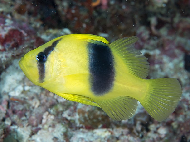 『幼魚は灰色から青色を帯びた体色で、体の後半部に黄色で、背ビレの棘条部は黒色です❗』