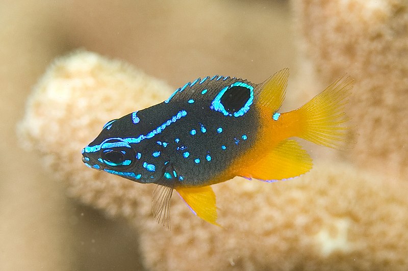 青い模様が顔から後方に続き、背ビレに目玉模様があります。
