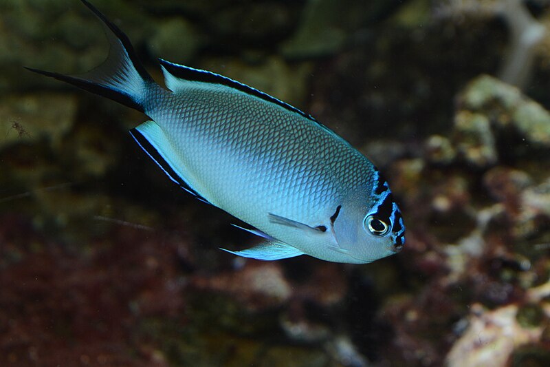 メスは淡い青色で頭部に眼を通る黒色帯があり尾ビレの上、下葉に
