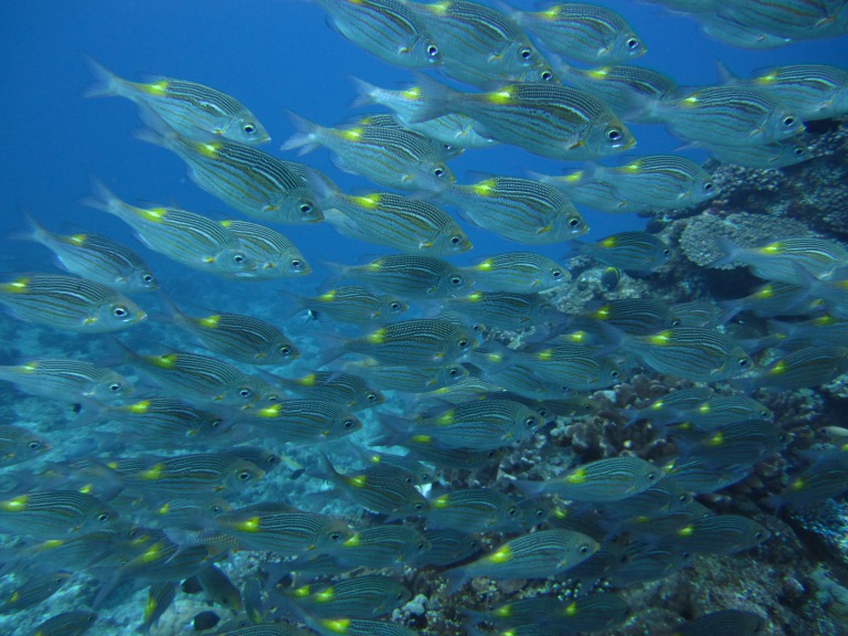 沿岸の浅い岩礁域やサンゴ礁域などに群れで生息しています。