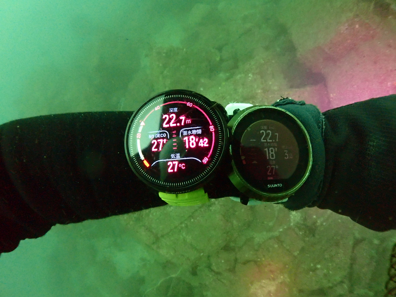 最新のダイブコンピューターをゲストさんにつけて頂き、違いを比べて頂きました。